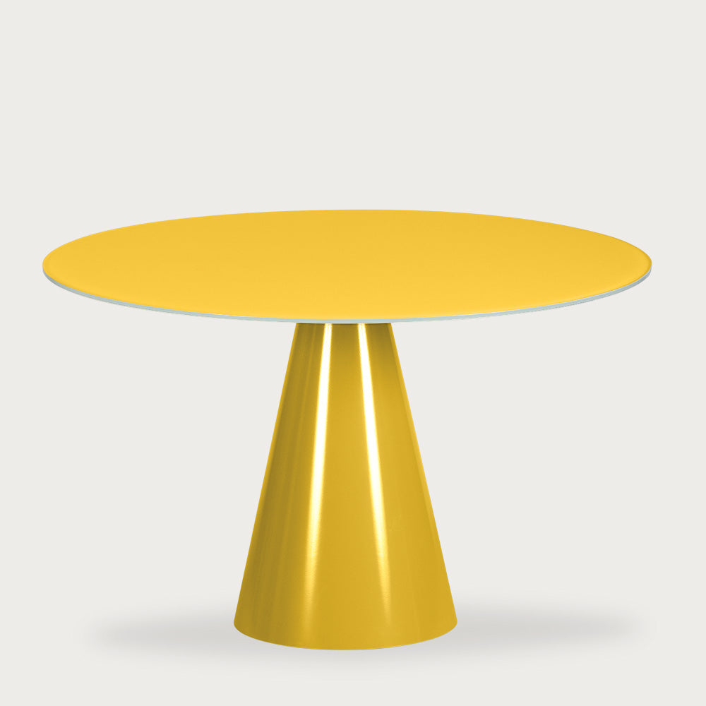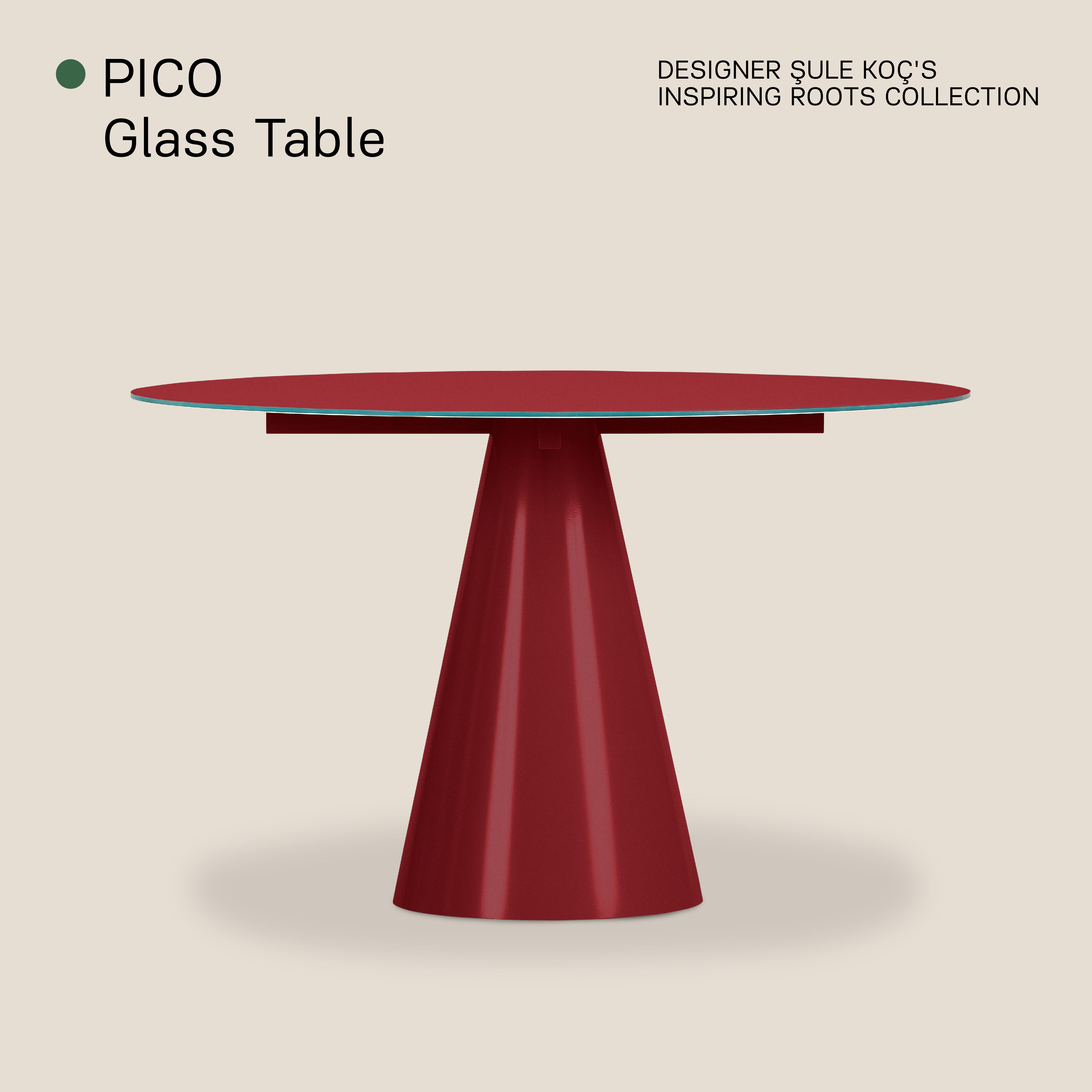 Pico Cam Yuvarlak Masa’nın Bordo renkli versiyonu, mekana çarpıcı bir görünüm kazandırır. 90 cm çapındaki cam tablası ve aynı renkteki metal ayağı, modern mekanlar için zarif ve etkileyici bir seçenek sunar